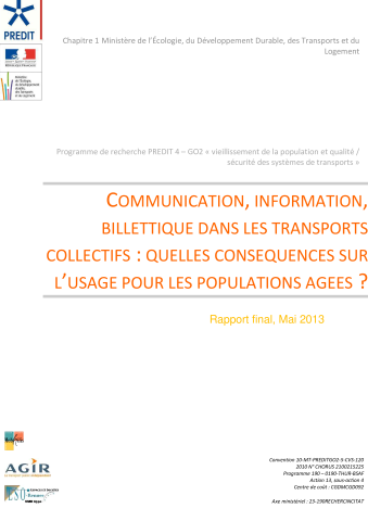 Régis Keerle, Alain Legendre, Nicole Roux, Sébastien Gonguet, Olivier David, et al.. Communication, information, billettique dans les transports collectifs : quelles conséquences sur l'usage par les populations âgées ?. [Rapport de recherche] Université Rennes 2 / Laboratoire ESO. 2013. ⟨halshs-00854327v2⟩