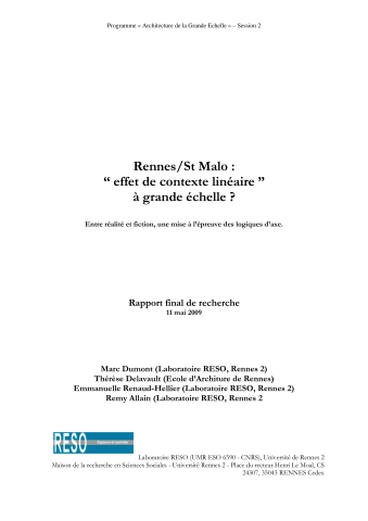 Marc Dumont, Thérèse Delavault, Emmanuelle Renaud-Hellier, Rémy Allain. Rennes/Saint-Malo : « effet de contexte linéaire » à grande échelle ? Entre réalité et fiction, une mise à l’épreuve des logiques d’axe. [Rapport de recherche] AGE-2007-ALL, Ministère de la culture et de la communication / Bureau de la recherche architecturale, urbaine et paysagère (BRAUP); Université Rennes 2; Laboratoire RESO. 2009. ⟨hal-01811028⟩