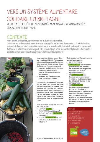 Blaise Berger, Catherine Darrot, Julien Noel. Vers un système alimentaire solidaire en Bretagne : Résultats de l'étude Solidarités alimentaires territorialisées (Solalter) en Bretagne. [Rapport de recherche] Agrocampus - Ecole nationale supérieure d'agronomie de rennes; FR CIVAM Bretagne. 2015. ⟨halshs-01466814⟩