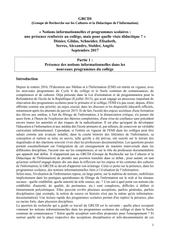 Gildas Dimier,, Élisabeth Schneider, Alexandre Serres, Angèle Stalder. Notions informationnelles et programmes scolaires : une présence renforcée au collège, mais pour quelle visée didactique ? Partie 1 : Présence des notions informationnelles dans les nouveaux programmes du collège. [Rapport de recherche] URFIST de Rennes. 2017. ⟨sic_01599119⟩