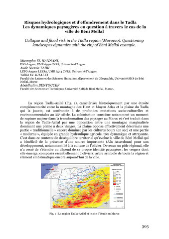 Mustapha El Hannani, Yahia El Khalki, Aude Nuscia Taïbi, Abdelhalim Benyoucef. Risques hydrologiques et d’effondrement dans le Tadla. Les dynamiques paysagères en question à travers le cas de la ville de Béni Mellal. Presses Universitaires d'Angers. Eau, milieux et aménagement. Une recherche au service des territoires, pp.305-316, 2014, 9782915751536. ⟨hal-01105170⟩