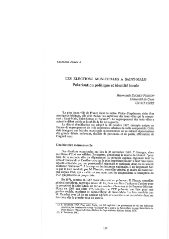 Raymonde Séchet. Les élections municipales à Saint-Malo. Polarisation politique et identité locale. collectif. L'Ouest politique 75 ans après Siegfried, Centre de publications de l'université de Caen, pp.199-209, 1987, Géographie sociale 6. ⟨halshs-00768686⟩