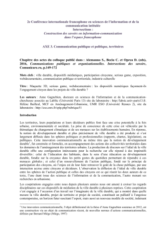 Anne Gagnebien, Hélène Bailleul. Maquette 3D, serious game, webdocumentaire : les dispositifs numériques façonnent-ils l’engagement citoyen dans les projets de ville durable ?. Alemanno Sylvie; Beciu Camelia; Oprea Denisa-Adriana. Communications publiques et organisationnelles. Intersections des savoirs, Comunicare.ro, pp.149-172, 2016, 978-973-711-550-8. ⟨halshs-01638989⟩