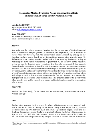 Jean-Eudes Beuret, Anne Cadoret. Measuring Marine Protected Areas’ Conservation Effort: A Different Look at Three Deeply-Rooted Illusions. Protected Area Management - Recent Advances, 2021. ⟨hal-03318275⟩