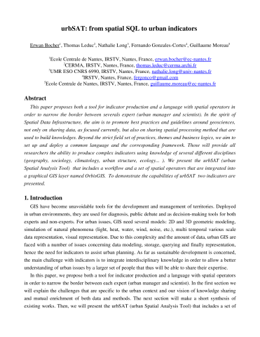 Erwan Bocher, Thomas Leduc, Nathalie Long, Fernando González Cortés, Guillaume Moreau. urbSAT: from spatial SQL to urban indicators. Free and Open Source Software for Geospatial Conference - FOSS4G'2008, Sep 2008, Cape Town, South Africa. ⟨hal-00329505⟩