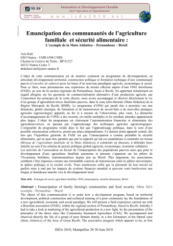 Aziz Kali. Emancipation des communautés de l'agriculture familiale et sécurité alimentaire : L'exemple de la Mata Atlántica – Pernambouc – Brésil. ISDA 2010, Jun 2010, Montpellier, France. 12 p. ⟨hal-00526982⟩