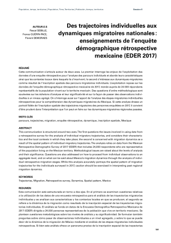 Pascal Sebille, France Guérin-Pace, Florent Demoraes. Des trajectoires individuelles aux dynamiques migratoires nationales : enseignements de l’enquête démographique rétrospective mexicaine (EDER 2017). CIST2020 - Population, temps, territoires, Collège international des sciences territoriales (CIST), Nov 2020, Paris-Aubervilliers, France. pp.191-196, ⟨10.13140/RG.2.2.10009.65122⟩. ⟨hal-03058742⟩