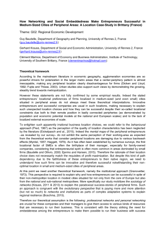 Guy Baudelle, Gerhard Krauss, Clément Marinos. How Networking and Social Embeddedness Make Entrepreneurs Successful in Medium-Sized Cities of Peripheral Areas: A Location Case-Study in Brittany (France). 57th ERSA Congress, Aug 2017, Groningen, Netherlands. ⟨hal-01583123⟩