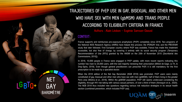 Alain Léobon, Eugénie Samson-Daoust. TRAJECTORIES OF PrEP USE IN GAY, BISEXUAL AND OTHER MEN WHO HAVE SEX WITH MEN (gbMSM) AND TRANS PEOPLE ACCORDING TO ELIGIBILITY CRITERIA IN FRANCE. The 30th Annual Canadian Conference on HIV / AIDS Research, May 2021, VIRTUEL - ON LINE, Canada. 2021. ⟨halshs-03508825⟩