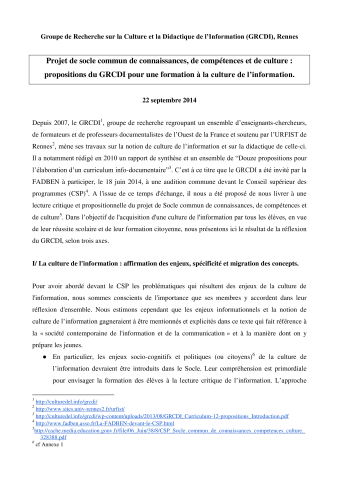Depuis 2007, le GRCDI, groupe de recherche regroupant un ensemble d'enseignants-chercheurs, de formateurs et de professeurs documentalistes de l'Ouest de la France et soutenu par l'URFIST de Rennes, mène ses travaux sur la notion de culture de l'information et sur la didactique de celle-ci. Il a notamment rédigé en 2010 un rapport de synthèse et un ensemble de "Douze propositions pour l'élaboration d'un curriculum info-documentaire". C'est à ce titre que le GRCDI a été invité par la FADBEN à participer, le 18 juin 2014, à une audition commune devant le Conseil supérieur des programmes (CSP). A l'issue de ce temps d'échange, il nous a été proposé de nous livrer à une lecture critique et propositionnelle du projet de Socle commun de connaissances, de compétences et de culture. Dans l'objectif de l'acquisition d'une culture de l'information par tous les élèves, en vue de leur réussite scolaire et de leur formation citoyenne, nous présentons ici le résultat de la réflexion du GRCDI.