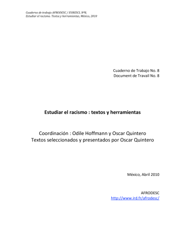 Odile Hoffmann, Oscar Quintero. Estudiar el racismo, textos y herramientas Antología de textos teóricos traducidos al español referidos al etudio del racismo. 2010. ⟨halshs-00691352⟩