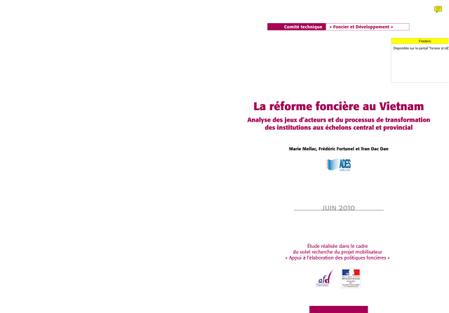 Marie Mellac, Frederic Fortunel, Dac Dan Tran. La réforme foncière au Vietnam : Analyse des jeux d'acteurs et du processus de transformation des institutions aux échelons central et provincial. 2010, pp.195. ⟨halshs-00518973⟩