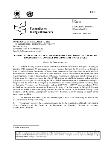 Report of the work of the expert group on maintaining the ability of biodiversity to continue to support the water cycle