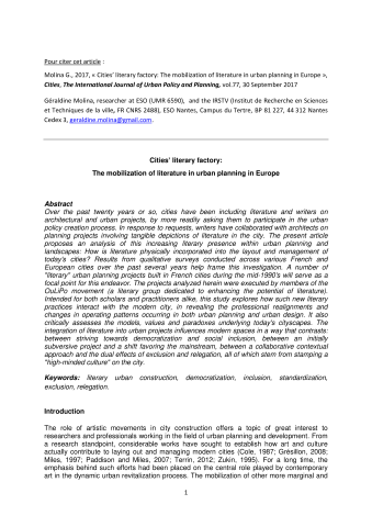 Géraldine Molina. Cities literary factory: The mobilization of literature in urban planning in Europe. Cities, Elsevier, 2018, 77, pp.4 - 12. ⟨10.1016/j.cities.2017.08.016⟩. ⟨hal-01793380⟩