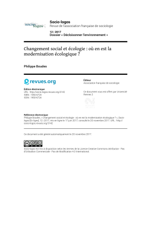 Philippe Boudes. Changement social et écologie : où en est la modernisation écologique ? . Socio-logos : Revue publiée par l'Association Française de Sociologie, Association Française de Sociologie, 2017, Décloisonner l'environnement, 12. ⟨halshs-01638788⟩
