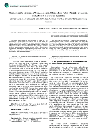 Toufik Ait Omar, Aude Nuscia Taïbi, Mustapha Hannani, Yahia Khalki. Géomorphosite karstique d’Ain Asserdoune, Atlas de Béni Mellal (Maroc) : inventaire, évaluation et mesures de durabilité. Dynamiques Environnementales - Journal international des géosciences et de l’environnement, Presses universitaires de Bordeaux [1983-2020] ; CEDETE (Université d'Orléans) (2021-..), 2020. ⟨hal-03286577⟩