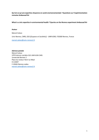 Marcel Calvez. Qu’est-ce qu'une expertise citoyenne en santé environnementale ? : Questions sur l'expérimentation rennaise Ambassad'Air. Environnement, Risques and Santé, John Libbey Eurotext, 2018, 17 (5), pp.498-504. ⟨10.1684/ers.2018.1214⟩. ⟨halshs-01907995⟩