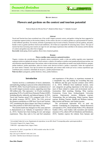 Travel and Tourism have been considered one of the world's largest economic sectors, and garden visiting has been suggested as an important segment (niche) on the tourism industry. In this context, the aim is to analyze gardens as a great potential for tourism, in their different specificity. For tourism, all kinds of greenspaces may be used as historic, botanical or private gardens, and parks, besides events as garden and flower festival and exhibitions. All of them are responsible for attracting many visitors. This type of tourism has been increasing since tourists are eager for new and unique experiences that contribute to the memory and the identity of a nation and gardens may allow this to happen. Resumo Flores e jardins como contexto e potencial turístico Viagens e turismo são considerados um dos grandes setores econômicos, sendo a visita aos jardins sugerida como importante segmento (nicho) na indústria do turismo. Nesse contexto, o objetivo foi analisar os jardins como grande potencial para turismo, nas suas diferentes especificidades atuais. Para turismo, todos os tipos de áreas verdes podem ser usados como jardins históricos, parques, jardins botânicos, jardins particulares, além de eventos como festivais de flores e jardins e exposições. Todos são responsáveis por atrair muitos visitantes. Esse tipo de turismo tem aumentado, pois turistas estão ávidos por novas e únicas experiências que contribuem para a memória e identidade de um povo, e jardins proporcionam isso. Palavras-chave: paisagismo, jardins históricos, feiras, jardins botânicos.