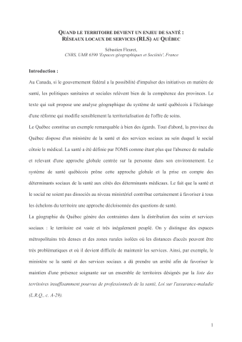 Sebastien Fleuret. Quand le territoire devient un enjeu de santé : réseaux locaux de services (RLS) au Québec. Études canadiennes / Canadian Studies : Revue interdisciplinaire des études canadiennes en France, Association française des études canadiennes (AFEC), 2006, pp.89-112. ⟨halshs-00175559⟩