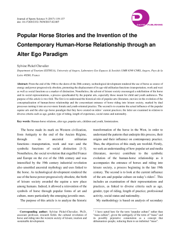 Sylvine Pickel-Chevalier. Popular Horse Stories and the Invention of the Contemporary Human-Horse Relationship through an 'Alter Ego' paradigm. Journal of Sports Science, David Publisher, 2017, pp.119-137. ⟨10.17265/2332-7839/2017.02.007⟩. ⟨hal-01571632⟩