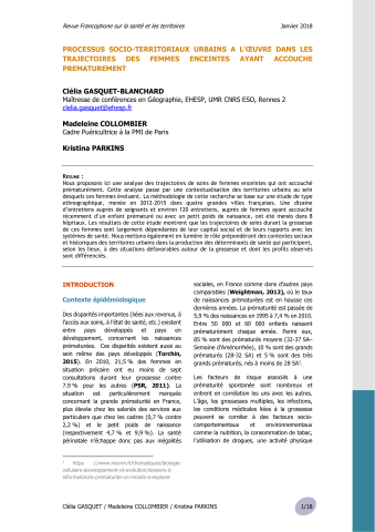 Clelia Gasquet, Madeleine Collombier, Kristina Parkins. Processus socio-territoriaux urbains à l'oeuvre dans les trajectoires des femmes enceintes ayant accouché prématurément. Revue francophone sur la santé et les territoires, hypotheses.org, 2018, ⟨10.4000/rfst.704⟩. ⟨hal-01737086⟩