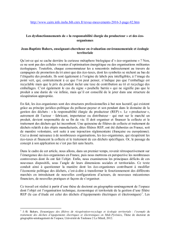 Jean-Baptiste Bahers. Les dysfonctionnements de « la responsabilité élargie du producteur » et des éco-organismes . Mouvements : des idées et des luttes, La découverte, 2016, Où va l’homo detritus ?, 2016/3 (n° 87), pp 82 - 95. ⟨10.3917/mouv.087.0082⟩. ⟨halshs-01517864⟩