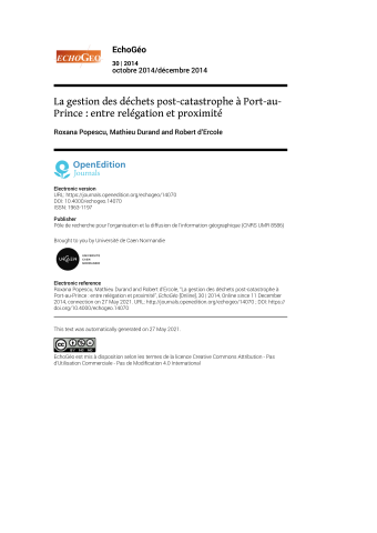 Popescu Roxana, Mathieu Durand, Robert d'Ercole. La gestion des déchets post-catastrophe à Port-au-Prince : entre relégation et proximité. EchoGéo, EchoGéo, 2014, 30, http://echogeo.revues.org/14070. ⟨10.4000/echogeo.14070⟩. ⟨hal-01152881⟩