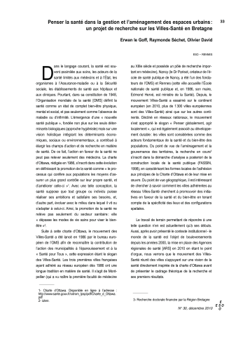 Erwan Le Goff, Raymonde Séchet, Olivier David. Penser la santé dans la gestion et l'aménagement des espaces urbains: un projet de recherche sur les Villes-Santé en Bretagne. ESO Travaux et Documents, Espaces et SOciétés - UMR 6590, 2010, pp.33-41. ⟨halshs-00551589⟩