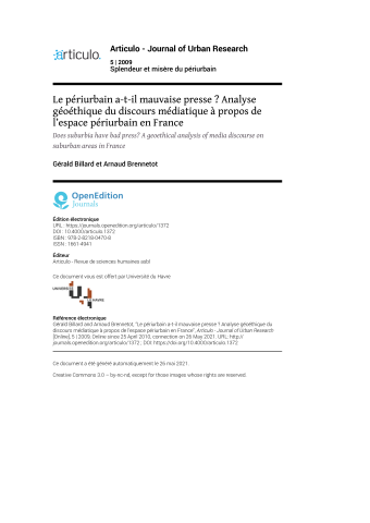 Gerald Billard, Arnaud Brennetot. Le périurbain a-t-il mauvaise presse ? Analyse géoéthique du discours médiatique à propos de l’espace périurbain en France. Articulo - Journal of Urban Research, Articulo - Revue de sciences humaines asbl, 2009, ⟨10.4000/articulo.1372⟩. ⟨hal-01626399⟩