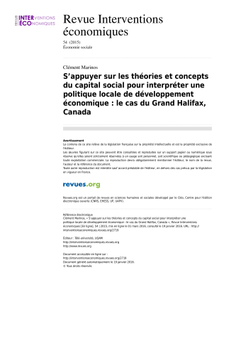 Clément Marinos. S’appuyer sur les théories et concepts du capital social pour interpréter une politique locale de développement économique : Le cas du Grand Halifax, Canada. Interventions Economiques : Papers in Political Economy, Québec: Télé-université, 2016, Économie sociale et solidaire : ses écosystèmes. ⟨hal-01297777⟩