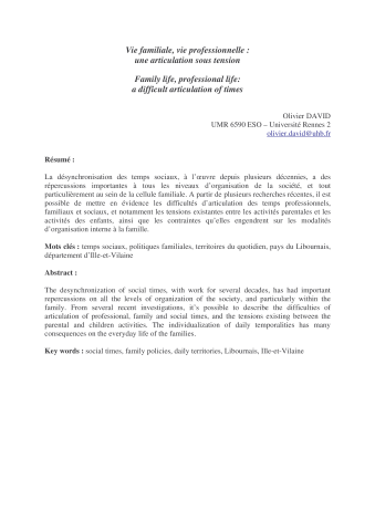 Olivier David. Vie familiale, vie professionnelle : une articulation sous tension. Espace Populations Sociétés, Centre National de la Recherche Scientifique, 2007, pp.191-202. ⟨halshs-00291254⟩