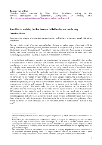 Géraldine Molina. Starchitects: walking the line between individuality and conformity. Métropolitiques.eu, Métropolitiques, 2015, The Renewed Relevance of Urban-Planning Models?, https://www.metropolitiques.eu/Starchitects-walking-the-line.html. ⟨hal-01591330⟩