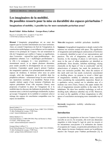 Benoît Feildel, Hélène Bailleul, Georges-Henry Laffont. Les imaginaires de la mobilité. De possibles ressorts pour la mise en durabilité des espaces périurbains ?. RTS - Recherche Transports Sécurité, IFSTTAR, 2014, Les sens des circulations, 2014 (02-03), pp.143-160. ⟨10.4074/S0761898014002064⟩. ⟨halshs-01084387⟩