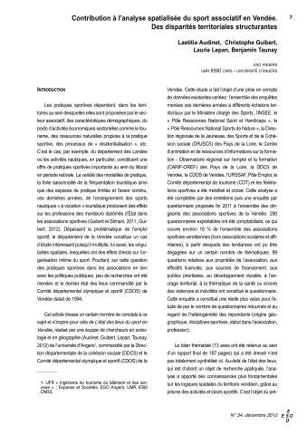 Laetitia Audinet, Christophe Guibert, Laurie Lepan, Benjamin Taunay. Contribution à l'analyse spatialisée du sport associatif en Vendée. Des disparités territoriales structurantes. ESO Travaux et Documents, Espaces et SOciétés - UMR 6590, 2012, pp.7-17. ⟨halshs-00847597⟩