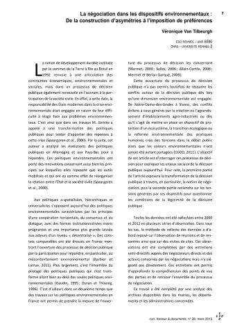 Véronique van Tilbeurgh. La négociation dans les dispositifs environnementaux : De la construction d'asymétries à l'imposition de préférences. ESO Travaux et Documents, Espaces et SOciétés - UMR 6590, 2015, pp.7-14. ⟨hal-01644509⟩