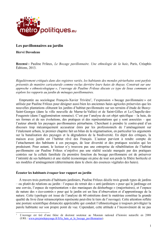 Hervé Davodeau. Les pavillonnaires au jardin. Métropolitiques.eu, Métropolitiques, 2015. ⟨hal-01243134⟩