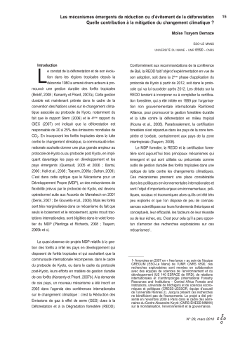 Moise Tsayem Demaze. Les mécanismes émergents de réduction ou d'évitement de la déforestation : quelle contribution à la mitigation du changement climatique ?. ESO Travaux et Documents, Espaces et SOciétés - UMR 6590, 2010, pp.15-20. ⟨halshs-00508971⟩