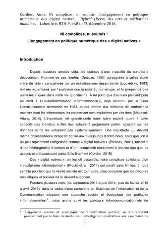 Anne Cordier. Ni complices, ni soumis : L’engagement en politique numérique des digital natives . Hybrid. Revue des arts et médiations humaines, Labex Arts H2H/Presses Universitaires de Vincennes, 2016, Cultures numériques : alternatives. ⟨halshs-01598271⟩
