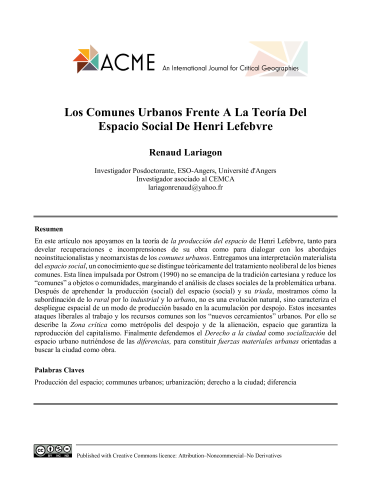 Renaud Lariagon. Los Comunes Urbanos Frente a la Teoría del Espacio Social de Henri Lefebvre. ACME: An International E-Journal for Critical Geographies, University of British Columbia, Okanagan, 2020, 3 (19), pp.610-627. ⟨hal-03078568⟩