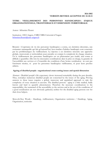 Sébastien Fleuret. Vieillissement des personnes handicapées : enjeux organisationnels, transversaux et dimension territoriale. Cahiers de géographie du Québec, Département de géographie de l'Université Laval, 2011, 55 (156), pp.529 - 553. ⟨10.7202/1008893ar⟩. ⟨hal-03110057⟩