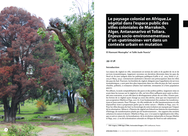 Aude Nuscia Taïbi, Mustapha El Hannani. Le végétal dans l’espace public des villes coloniales de Marrakech, Alger, Antananarivo et Toliara. Enjeux socio-environnementaux d’un « patrimoine » vert dans un contexte urbain en mutation. Africana studia, Centro de Estudos Africanos da Universidade do Porto, 2019, Le paysage colonial en Afrique, pp.27-38. ⟨hal-02984884⟩