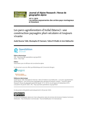 Aude Nuscia Taïbi, Mustapha El Hannani, Yahia El Khalki, Aziz Ballouche. Les parcs agroforestiers d'Azilal (Maroc) : une construction paysagère pluri-séculaire et toujours vivante. Revue de Géographie Alpine / Journal of Alpine Research, Association pour la diffusion de la recherche alpine, 2019, Les petites paysanneries des arrière-pays montagneux et forestiers (107-3), ⟨10.4000/rga.6612⟩. ⟨hal-02514419⟩