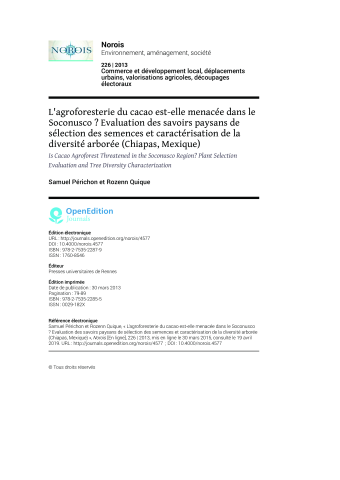 Samuel Perichon, Rozenn Quique. L'agroforesterie du cacao est-elle menacée dans le Soconusco ? Evaluation des savoirs paysans de sélection des semences et caractérisation de la diversité arborée (Chiapas, Mexique). Norois, Presses universitaires de Rennes, 2015, ⟨10.4000/norois.4577⟩. ⟨halshs-02424820⟩