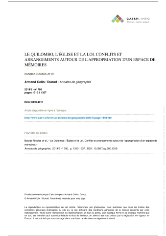 Nicolas Bautès, Flavia Carolina da Costa, Rafael Soares Gonçalves. Le Quilombo, l’Eglise et la Loi. : Conflits et arrangements autour de l'interprétation du droit et de l'appropriation d'un espace de mémoires. Annales de géographie, Armand Colin, 2014, Illégalismes et gouvernement des territoires , 10 (700), pp.1310-1337. ⟨10.3917/ag.700.1310⟩. ⟨halshs-01496438⟩