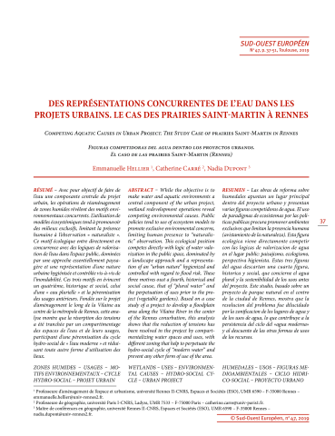 Emmanuelle Hellier, Catherine Carré, Nadia Dupont. Des représentations concurrentes de l'eau dans les projets urbains. Le cas des prairies Saint-Martin à Rennes. Sud-Ouest Européen, Presses Universitaires du Mirail - CNRS, 2019, L'eau au service de territoires? Entre valorisation et instrumentalisation, pp.41-55. ⟨halshs-02333805⟩