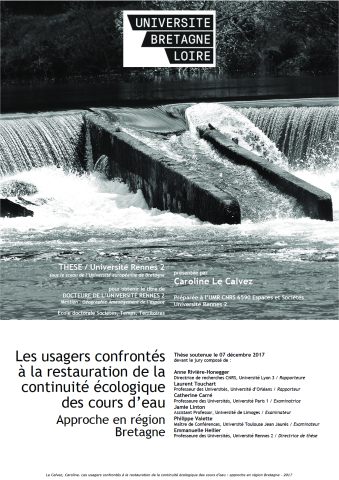 Caroline Le Calvez. Les usagers confrontés à la restauration de la continuité écologique des cours d’eau : approche en région Bretagne. Géographie. Université Rennes 2, 2017. Français. ⟨NNT : 2017REN20053⟩. ⟨tel-01827251⟩