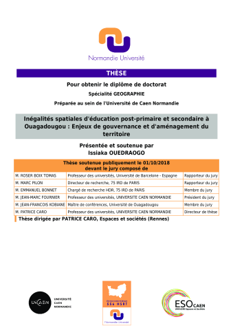 Issiaka Ouedraogo. Inégalités spatiales d'éducation post-primaire et secondaire à Ouagadougou : enjeux de gouvernance et d'aménagement du territoire. Géographie. Normandie Université, 2018. Français. ⟨NNT : 2018NORMC011⟩. ⟨tel-01947271⟩