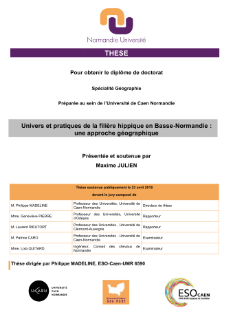 Maxime Julien. Univers et pratiques de la filière hippique en Basse-Normandie : une approche géographique. Géographie. Normandie Université, 2018. Français. ⟨NNT : 2018NORMC002⟩. ⟨tel-01867559⟩