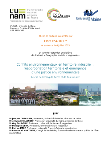 Clara Osadtchy. Conflits environnementaux en territoire industriel : réappropriation territoriale et émergence d'une justice environnementale : le cas de l'étang de Berre et de Fos-sur-Mer. Géographie. Université du Maine, 2015. Français. ⟨NNT : 2015LEMA3005⟩. ⟨tel-01264711⟩