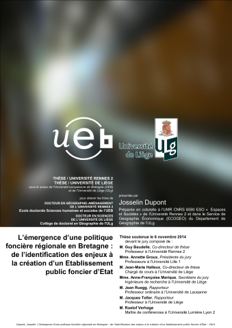 Josselin Dupont. L'émergence d'une politique foncière régionale en Bretagne : de l'identification des enjeux à la création d'un établissement public foncier d'Etat. Géographie. Université Rennes 2; Université de Liège, 2014. Français. ⟨NNT : 2014REN20020⟩. ⟨tel-01127324⟩